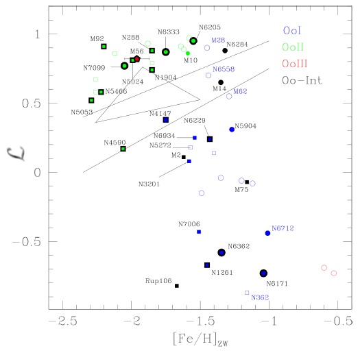 From the PSF-fitting photometric analysis of our images in § 2, we were able to recover 4845 stars, 3630 (≈ 75%) of which have a high probability to be cluster members. This allowed us to create a clean CMD by removing the field stars (Figure 5). We used the models from VandenBerg et al. (2014) to generate a ZAHB and four isochrones of ages ranging from 12.0 - 13.5 Gyrs with a metallicity of [Fe/H]ZW = -2.0, Y=0.25 and [α/Fe]=0.4. Also, using the Eggleton code (Pols et al. 1997; Pols et al. 1998; Schröder et al. 1997) we generated another ZAHB for a core mass of 0.50M0 , and three evolutionary tracks corresponding to total masses of 0.64, 0.65, and 0.66M0 . The isochrones and the ZAHBs were shifted to a distance of 10 kpc using a reddening E(B−V ) = 0.26. The small discrepancy between the ZAHB from the models of VandenBerg and Eggleton is due to the assumed core mass of the progenitor star. Although the sample of RR Lyrae stars is small, the fact that the RRc and RRab stars are on the first overtone and fundamental sides of the first overtone blue edge (FOBE), is consistent with the mode distribution found in other OoII type clusters, e.g. Yepez et al. (2020). A useful quantity to help describe the morphology of the HB is the Lee parameter (Lee 1990) defined as L = (B−R)/(B + V + R), where B is the number of stars on the blue side of the instability strip (IS) or the first overtone blue edge (FOBE), R is the number of stars on the red side of the IS or fundamental mode red edge (FMRE) and V is the number of variable stars within the IS. In the case of M56, this yields an L = 0.82. Figure 7 shows a plot of L vs [Fe/H]ZW where globular clusters previously studied by our group following the same approach as the one used in this work, are plotted. The triangle in Figure 7 is defined by Catelan (2009) as a region that is preferentially populated by clusters thought to be of extragalactic origin. M56 falls well above this triangular region. The HB of M56 is predominately blue, which is usually seen in most metal-poor Oosterhoff II (OoII) type clusters. While it is not possible to discuss the Oo-type of M56 given the scarce number of RR Lyrae stars, the extremely large period of the only RRab star V12, makes the case most peculiar even among Oo-II type clusters. Its position on the L vs [Fe/H]ZW plane, however, makes it difficult to support its possible extragalactic origin on these grounds.