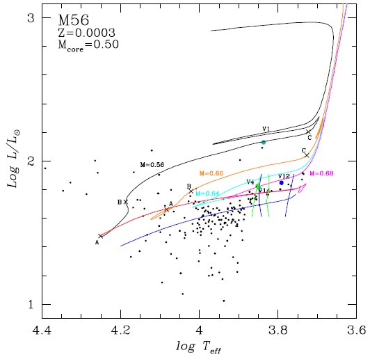 In Figure 8 there are also shown the positions of the RRab V12 (blue dot), RRc V4 and V14 stars (green dots) and the only CW V1 star (teal dot), along with the theoretical borders of the instability strip for the fundamental and first overtone modes (Bono et al. 1994). The red line is the ZAHB for the stars with a He-core of 0.50M⊙. The blue line corresponds to the ZAHB calculated with the models of VandenBerg et al. (2014) for [Fe/H]=-2.0, Y=0.25 and [α/Fe]=+0.4; this ZAHB starts with a core mass of 0.49M⊙ that decreases towards the blue and for this reason it lies a bit below of the red line. Black, orange, cyan and lilac loci are tracks for total masses of 0.56, 0.60, 0.64, 0.68 M⊙, respectively, i.e. for envelopes with 0.06, 0.10, 0.14 and 0.18 M⊙. The RR Lyrae stars lie between tracks with envelopes of 0.14-0.18 M⊙. The CW star, V1, seems well represented by a track with a very thin envelope (0.06M0 ) which has originated at the bluest part of HB. Considering an age range of 12.0 - 13.5 Gyrs, the probable progenitor star of the stars on the HB had an initial mass of ≈ 0.81 - 0.83 M⊙ at the ZAMS. Such a star lost between 0.15 and 0.26 M⊙ during the He flashes in its evolution from the RGB towards the ZAHB.