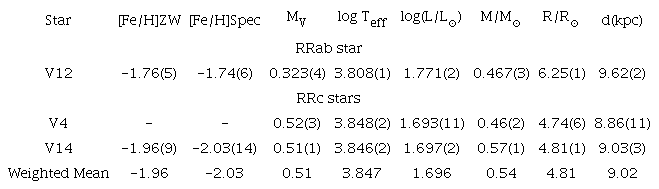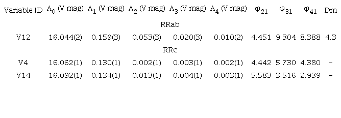 As a result we have a metallicity estimation via the Fourier approach for one RRc star (V14); [Fe/H]Spec = −2.03 ± 0.14. This value is, however, consistent with the standard value reported by Harris (1996) of −1.98.