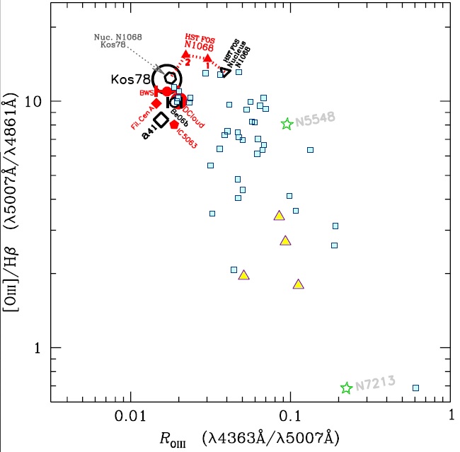 (c) The CentaurusA (NGC5128) filaments. The red square represents the average ratio of seven optical filaments studied by Morganti et al. (1991, hereafter Mo91) and situated along the radio jet at a mean distance of 490pc from the nucleus of the radio-galaxy CentaurusA (mean ROIII = 0.0145 with a dispersion of 0.13dex).