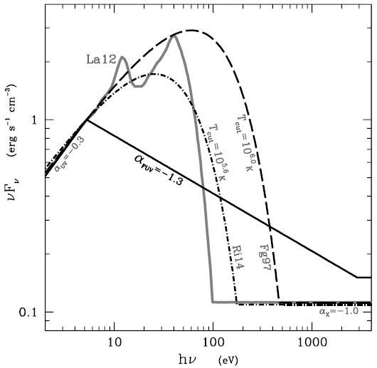 B: the dot-dashed line represents the ‘optimized SED’ used by Richardson et al. (2014, hereafter Ri14) in their calculations of LOC models. It shares the same index αUV as the Fg97 SED above, but assumes a lower Tcut of 105.52 °K to describe the thermal bump. It is significantly softer than the Fg97 SED, yet due to collisional deexcitation being important in LOC models, these qualitatively reproduces the ROIII and Heii/Hβ (λ4686Å/λ4861Å) ratios of their reconstructed Seyfert2 emission line spectra.