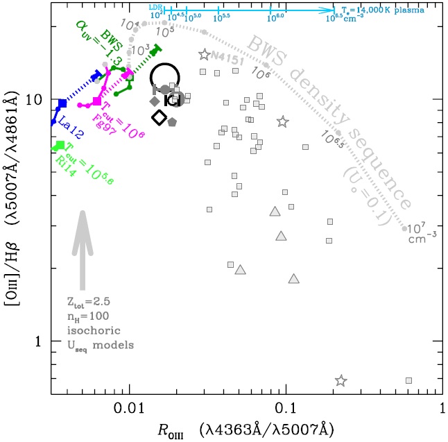 All our calculations will be presented in Figure 3 in which the reference data set is represented using the same symbols but coloured in gray. For an isothermal plasma at a fixed temperature, densities much above LDR would cause an increase of the ROIII ratio, shifting its position to the right in Figure 3 due to collisional deexcitation. The segmented cyan arrow describes the increase in ROIII expected from a 14000°K plasma slab whose density successively takes on the values of 102 (LDR), 104.5 , 105, 105.5 , 106 and 106.5 cm−3. It illustrates the density range implied by the BL05 and RA00 TypeI AGN if they shared the same temperature. For a 15000°K plasma, the critical densities5 for deexcitation of the [OIII] λ5007Å and λ4363Å lines are 7.8 × 105 and 2.9×107 cm−3, respectively, while for the[ArIV] λ4711Å and λ4740Å lines these are 1.7 × 104 and 1.5 × 105 cm−3. Let us compare the data with the values predicted by photoionization calculations.