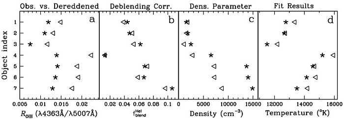 To facilitate the evaluation of these fits, we show in Figure 4 how the parameters compare for each object between Table 1 (triangles) and Table 2 (stars). Panel(a) represents the target ROIII ratios, dereddened vs. observed, Panel(b) the deblending correction , Panel(c) the the cut-off density vs. dust drop-out density scale, and Panel(d) the temperatures inferred from the fits. The e-folding dust screen densities, nopa, derived by OSALD lie in the range 1500 to 16000cm−3. The average hTOIIIi for the seven Seyfert2’s is 13480±1180°K, being lower by only 500°K with respect to the single density case.