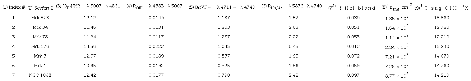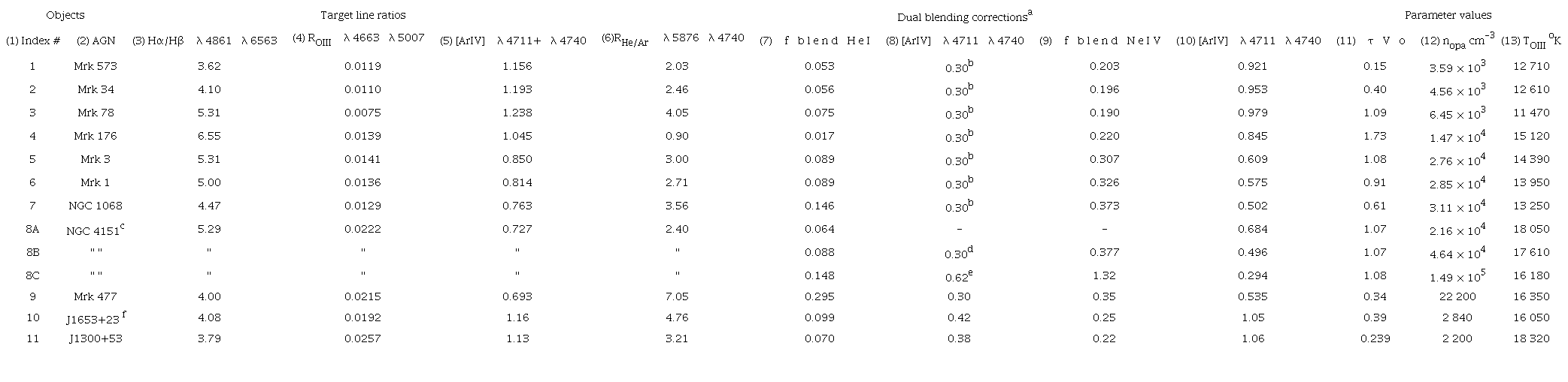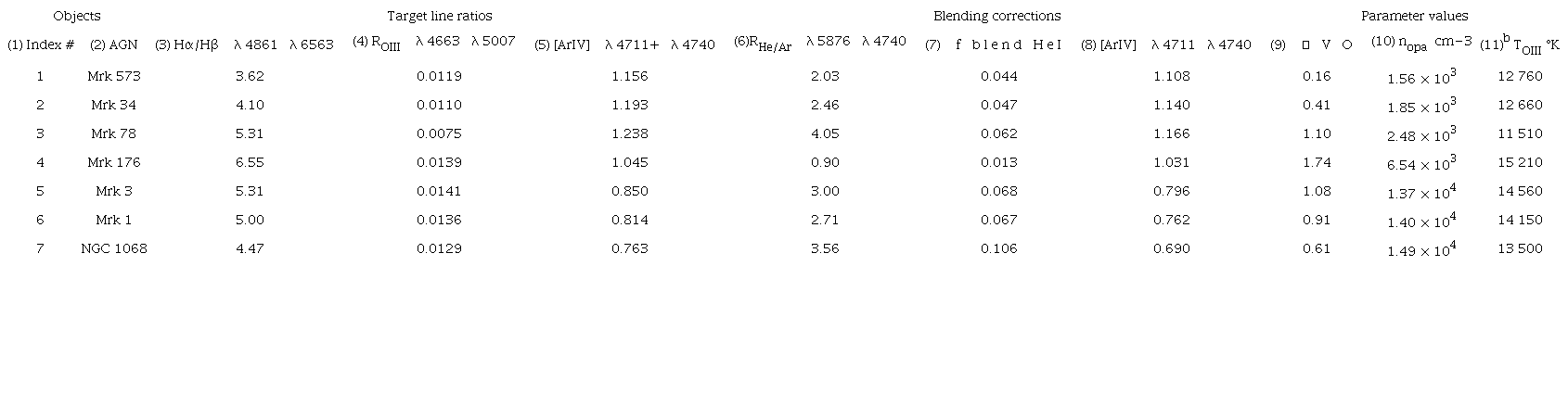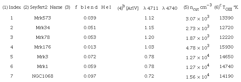 We present complementary calculations in Table 3 where we have assumed the hypothetical case of the λλ4725Å doublet reaching 30% of the observed [ArIV] λ4740Å line intensity. The blending contributions from the Hei and [NeIV] λλ4715Å lines, that is and , are presented in Columns(7) and (9), respectively, and the resulting deblended [ArIV] doublet ratios are listed in Column(10). The opacities (Column11) inferred remain about the same, but the e-folding densities nopa (Column12) are typically larger with respect to Table 2. The average sample temperature hTOIIIi is lower by only 125°K. At least for the Kos78 sample at hand, not including the λλ4725Å doublet should not affect our conclusions concerning the Seyfert2 NLR temperatures.