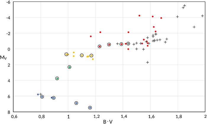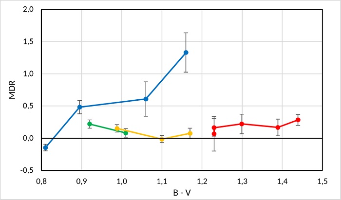 It would be natural to inquire how MDR depends on basic stellar parameters such as color index or absolute magnitude. Within each class, the variation of absolute magnitude is rather small; therefore we show the relation between observed redshift and color (Figure 8).