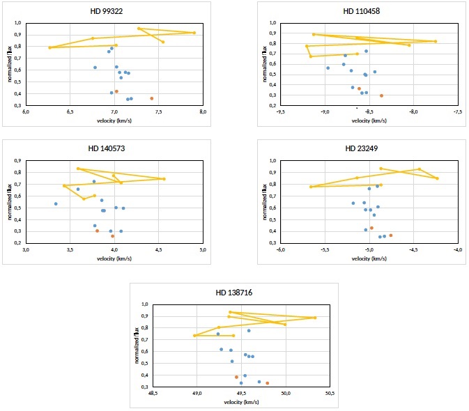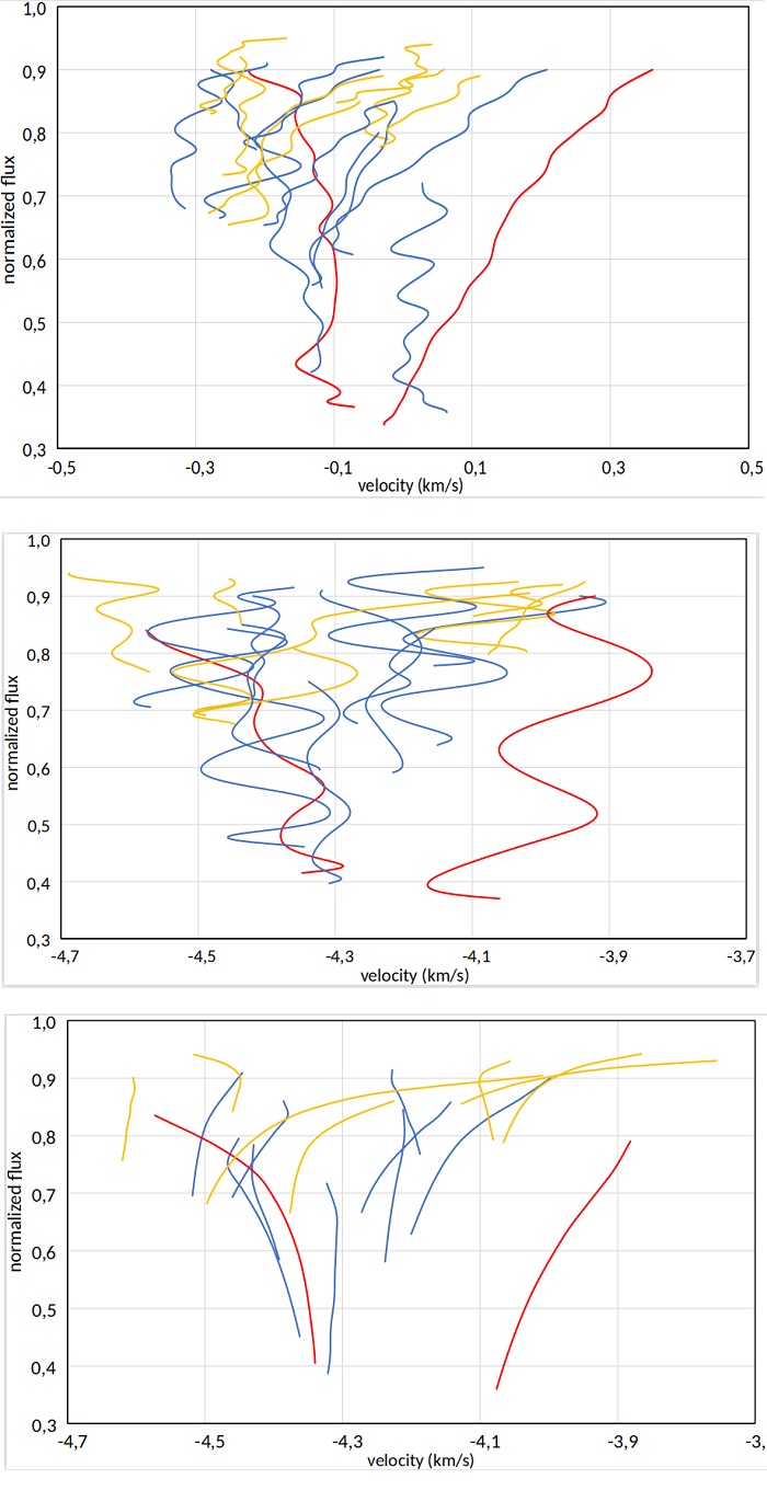 We flux-normalize the spectra with a third-grade polynomial. For the positions of the line cores we draw bisectors, which, additionally, give information on the line formation in deeper layers of the photosphere, and also serve as a quality test of the line, signaling eventual blends (Gray 2009).