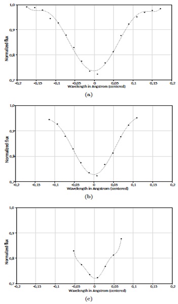 The number of data points to be included must be optimized for every line (Figure 3b); the correlation coefficient R2 has a (slight) local maximum. If many more points are included, the polynomial is clearly incapable of modelling the line profile (Figure 3a); and if many fewer points are used, the point-to-point noise becomes noticeable (Figure 3c). Of course, when including n+1 data for a grade-n polynomial, the fit is “perfect” but does not filter out the random flux errors, and noise deformations are evident.