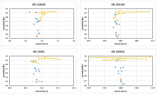 In cool giants, however, this explanation may not be sufficient, as can be seen, for example, in Gray & Pugh (2012). Sometimes the granulation diagrams show a broad distribution of line cores, with no consistent shape or slope (like the star HD34055 in Figure 6).