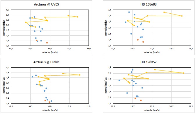The most straightforward way of drawing bisectors is to interpolate between the data points, using linear segments or some type of spline, and to compute the bisector of this interpolated curve. Applying this method, the bisectors we obtain from the Arcturus-Hinkle spectrum are quite wavy (Figure 2a) and much more so in the Arcturus-UVES spectrum (Figure 2b); this renders the core positions ambiguous. We attribute this to the resolution and/or sampling: UVES resolution is 8 × 104, while 3 × 105 is recommended for line asymmetry analysis, and 1 × 105 is considered a minimum (Dravins 1990; Landstreet 2017).