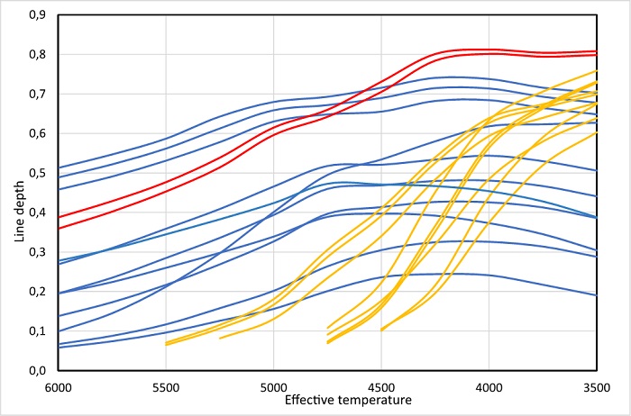 In search of an explanation for the differential redshift, we studied the temperature-dependence of these spectral lines, extracting synthetic spectra from VALD for eleven stellar temperatures between 3500 K and 6000 K and plotting these theoretical depths (Figure 9).