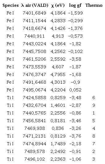 We chose our wavelength range to avoid TiO and telluric bands. In the present study we pursue the relation between iron and titanium lines, so we exclude other elements. Only on the diagrams we left the core positions of two Cr lines, which are the deepest lines in this range and provide a visual reference.