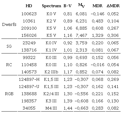 The stars were selected from the Paranal Observatory Project (POP) database seeking to cover uniformly several photometric groups. As this source offers only the observed V magnitude, we checked SIMBAD (Wenger, M. et al. 2000) for parallax and multiband magnitudes, to locate the stars on the HR diagram (Figure 1). Three parallaxes reported in SIMBAD are from the revised Hipparcos data (Van Leeuwen 2007); the other ten are from Gaia EDR3 (Vallenari et al. 2021). We divided our sample into several groups according to the location on the HR diagram without any allusion to evolutionary status; in particular, the stars labeled “Red Clump” are not necessarily helium-burning stars.