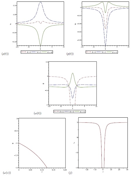 Figure 2 shows the evolution of the energy density, the pressure and the equation of state parameter with cosmic time. The evolution of ρ(t) shows that the only case allowed physically is the one with positive curvature k = +1. The plots of p(t) and ω(t) shows a Quintessence-dominated universe along with negative pressure. The existence of negative pressure agrees with the ’dark energy assumption’ which implies a negative pressure. Such evolutions of the three parameters have been found to be independent of the values of the prefactors α and β as shown in Table (2). The jerk parameter has the asymptotic value j = 1 at late-time. After making use of the relation between the scale factor and the redshift a = 1/1+z to express ω in terms of z, we find that