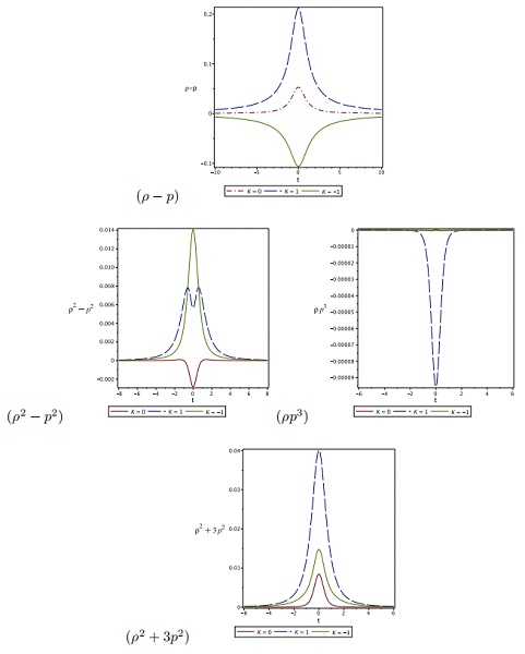 According to the strong energy condition (SEC), gravity should always be attractive. But this ‘highly restrictive’ condition fails when describing the current cosmic accelerated epoch and during inflation (Visser 1997a, Visser 1997b, Visser 1997c). In the current model we have a negative pressure which represents a repulsive gravity and, consequently, the SEC is not expected to be satisfied as indicated in Figure 3b. Only for the closed universe (K = +1), the null energy condition (NEC) (Figure 3a) and the dominant energy condition (Figure 3c) are satisfied all the time. Although most models of non-singular cosmologies require a violation of the NEC (ρ + p ≥ 0), avoiding such a violation would be preferable, if possible. The NEC is the most fundamental of the ECs and on which many key results are based, such as the singularity theorems (Alexandre and Polonyi 2021). Violation of NEC automatically implies the violation of all other point-wise energy conditions.