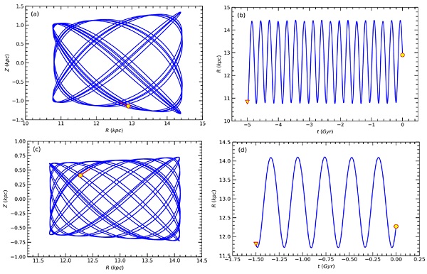 Figure 11 presents the orbits of NGC 1193 (Figure 11a) and NGC 1798 (Figure 11c) as functions of distance from the galactic center and the galactic plane (Z × RGC and RGC × t). The birth and presentday locations for the two clusters are marked with yellow triangles and circles in sub-figures 11b and 11d. Figures 11a and 11c show that both of the clusters entirely orbit outside the solar circle. The orbital eccentricities of NGC 1193 and NGC 1798 are smaller than 0.15, thus their orbits are close to circular. The results of orbital integrations imply that NGC 1193 reaches its maximum vertical distance from the galactic plane at Zmax = 1342±77 pc with an orbital period T = 370 ± 12 Myr, and these values correspond to Zmax = 725 ± 148 pc and T = 381 ± 23 Myr for NGC 1798. Considering the age values determined in this study for the clusters, we ran the GALPY program backwards in time and examined the resulting birth-places. The program indicated that the birth-place radial distances are 10.86 kpc and 11.82 kpc for NGC 1193 and NGC 1798, respectively, meaning that the clusters were born in the metal-poor region outside the solar circle.