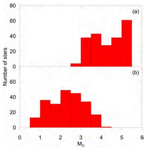The distribution of stars according to their brightness is defined as the luminosity function (LF). We used Gaia EDR3 photometric data to determine LFs for the two clusters. For this, main-sequence stars located inside the 8 arcmin limiting radii, as derived above, were selected for the two clusters. The magnitude ranges of the chosen stars are within the 17.25 ≤ G ≤ 20 mag for NGC 1193 and 16.5 ≤ G ≤ 20 mag for NGC 1798. We converted the G magnitudes of the selected stars to absolute magnitudes with the equation MG = G - 5 × log d+5+AG, where G is the apparent magnitude and d the distance derived earlier in this study. AG is the extinction for G magnitudes and is represented by AG = 0.84 × AV (Sun et al. 2021) (here AV is the extinction for V magnitudes). This led to the absolute magnitude ranges being limited within the 2.5 < MG< 5.5 and < MG< 4.5 mag for NGC 1193 and NGC 1798, respectively. We constructed LF histograms with the step-size 0.5 mag, as shown as Figure 12 for both clusters.