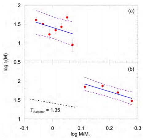 To convert these LFs to present day mass functions (PDMFs) we employed the PARSEC isochrones (Bressan et al. 2012), which give the ages and metal abundances (z) of the clusters. We utilized a high degree polynomial equation between G-band absolute magnitudes and masses of theoretical main-sequence stars. The resulting absolute magnitude-mass relation was used to transform the observational absolute G band magnitudes to masses. The number, mass range, and mean mass of main-sequence stars that resulted are 212, 0.85 ≤ M/M⊙ ≤ 1.2, and 0.99M⊙ for NGC 1193, and 226, 1.1 ≤ M/M⊙ ≤ 2, and 1.53 M⊙ for NGC 1798. The mass function PDMF can be approximated by a power law defined as by Salpeter (1955):