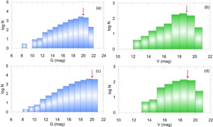 To obtain precise astrophysical parameters, we identified photometric completeness limits for each cluster. Stars fainter that these limits were not included in further analyses. G and V magnitude histograms were constructed to determine the photometric completeness limits for each clusters (see Figure 2). Stellar counts decrease for magnitudes fainter than G = 20 for both NGC 1193 (Figure 2a) and NGC 1798 (Figure 2c). Stellar counts decrease for magnitudes fainter than V = 19 for NGC 1193 (Figure 2b) and NGC 1798 (Figure 2d), indicating that incompleteness (of stellar recovery) has set in. Thus, for both clusters, we adopted these values as the cluster photometric completeness limits.