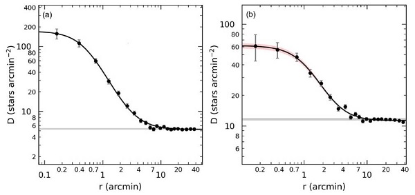 We utilized Radial Density Profile (RDP) analysis to determine the structural parameters of the clusters. First, we specified many concentric rings outwards from the cluster center, using the central coordinates given by Cantat-Gaudin et al. (2020). Stellar densities (ρ) were estimated for each ring by dividing the number of stars within the photometric completeness limit (G ≤ 20 mag) in it by the ring area. The resulting RDPs were fitted with King (1962) models via χ2 minimisation, giving estimates for the core, limiting, and effective radii of each cluster. The King (1962) model is described as ρ(r) = fbg + [f0/(1 + (r/rc)2)] where r is the radius from the cluster centre, fbg the background density, f0 the central density, and rc the core radius. See Figure 3 for each cluster’s RDP together with the best fitting King (1962) model to it. As a result of the fitting procedure, we inferred central stellar density, core radius and background stellar density as f0 = 166.865 ± 1.573 stars arcmin−2, rc = 0.526 ± 0.009 arcmin and fbg = 5.225 ± 0.124 stars arcmin−2 for NGC 1193 and f0 = 53.597 ± 3.789 stars arcmin−2, rc = 1.190 ± 0.056 arcmin and fbg = 11.318 ± 0.321 stars arcmin−2 for NGC 1798, respectively. At the r = 8 arcmin limiting radius, the stellar density becomes similar to the background density (a grey horizontal line) as seen in Figure 3a (NGC 1193) and Figure 3b (NGC 1798). Therefore, we concluded that the limiting radii for both clusters are rlim = 8 arcmin. We considered only the stars inside these limiting radii in further analyses.