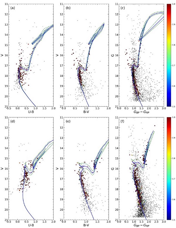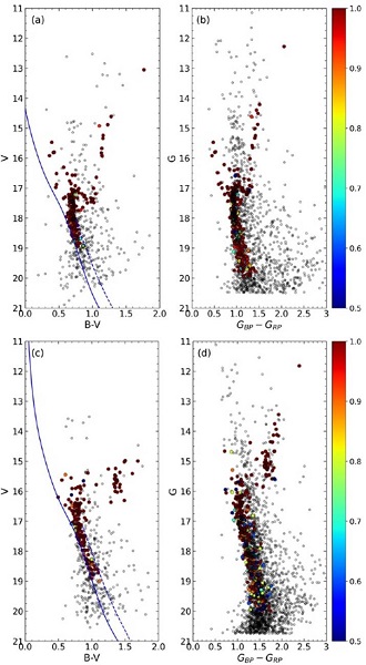 To take into consideration the impact of binary stars in the main-sequences of the studied clusters, we plotted the V × (B − V) CMDs of the stars within the cluster limiting radii (rlim) which we had obtained for the clusters and then fitted the Zero Age Main-Sequence (ZAMS) of Sung et al. (2013) to these diagrams. The ZAMS fitting was by eye according to the stars with the membership probability P ≥ 0.5 and shifted 0.75 mag towards brighter magnitudes in order to account for the most likely cluster binary stars (4a and c). During the ZAMS fitting we made sure for each cluster that the main-sequence, turn-off, and giant stars with membership probabilities P ≥ 0.5 were selected. The process resulted in 181 likely member stars for NGC 1193 and 161 for NGC 1798 which lie between the fitted ZAMS curves and are located inside the rlim radii. We used these stars to determine astrophysical parameters of the two clusters. Figure 4 shows the V × (B − V) CMDs with the best fitted ZAMS (Figures 4a and c) and G(GBP - GRP) CMDs (Figures 4b and d) with the background and most likely member stars. Figure 5 presents histograms of the number of stars located through the two cluster fields versus their membership probabilities. Vector-Point Diagrams (VPDs) were plotted for the stars within the limiting radii and are shown as Figure 6. It can be seen from the figure that NGC 1193 (Figure 6a) and NGC 1798 (Figure 6b) are affected by field stars but with the membership selection criteria, the ‘most likely’ cluster stars (shown as the colorscaled points in Figure 6) can be separated from field stars (grey dots in Figure 6). The mean proper motion components of the most likely cluster members are (µα cosδ, µδ) =(−0.207 ± 0.009,−0.431 ± 0.008) for NGC 1193 and (µα cosδ, µδ) = (0.793 ± 0.006, −0.373 ± 0.005) mas yr−1 for NGC 1798. Moreover, using these members we obtained mean trigonometric parallaxes of NGC 1193 and NGC 1798 as ϖGaia = 0.191±0.157 mas and ϖGaia = 0.203 ± 0.099 mas, respectively.