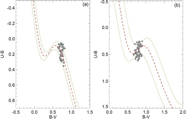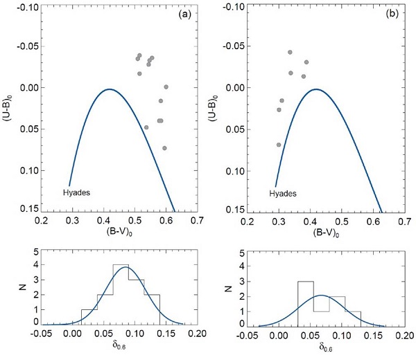 The determination of photometric metallicities of the two clusters employed the method given by Karaali et al. (2003a, b, 2011). This method is based on F and G type main-sequence stars and their UV-excesses as well as on stars whose color index range correspond to 0.3 ≤ (B - V)0 ≤ 0.6 mag (Eker et al. 2018, 2020). We selected F-G type main-sequence stars within the range 0.3 ≤ (B − V)0 ≤ 0.6 mag after calculating the intrinsic (B − V )0 and (U − B)0 colors of the most likely cluster member (P ≥ 0.5) stars. To determine the difference between the (U B)0 color indices of cluster stars and the Hyades main sequence which corresponds to the same (B − V)0 color indices, we constructed (U - B)0 (B - V)0 TCDs. This difference between cluster and Hyades stars is defined as the UV-excess which is expressed by the equation of δ = (U - B)0,H - (U - B)0,S, where H and S denote the Hyades and cluster stars respectively, which implies the same (B − V)0 color indices. By calibrating (B − V)0 of stars to (B − V)0 = 0.6 mag (i.e., δ0.6) we normalised the UV excess and plotted the histogram of normalised δ0.6 values. To calculate the mean δ0.6, we fitted a Gaussian to the distribution. Taking into account the Gaussian peak, the photometric metallicities of the studied clusters are obtained from the equation given by Karaali et al. (2011):