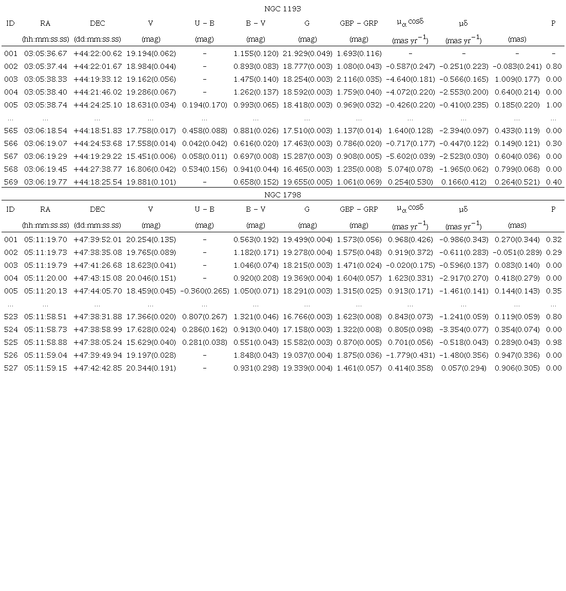 5. Mean proper motion components were calculated as (µα cos δ, µδ) = (−0.207 ± 0.009,−0.431 ± 0.008) mas yr−1 for NGC 1193 as well as (µα cos δ, µδ) = (0.793 ± 0.006, −0.373 ± 0.005) mas yr−1 for NGC 1798.