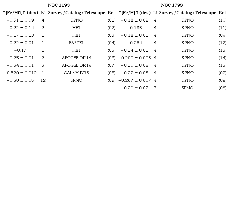 Many authors obtained spectroscopic metallicities of NGC 1193 and NGC 1798 based on groundbased observations, as listed in Table 3. Photometric metallicities calculated in this study are well supported by the spectroscopic studies presented in the literature. We conclude that our metallicity findings are reliable. Thus, we adopted our results for the determination of distance moduli and age.