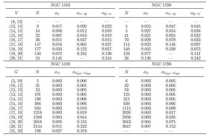 The (early) third data release of Gaia (hereafter Gaia EDR3, Gaia collaboration et al. 2021) provides high quality astrometric and photometric data of nearly 1.5 billion celestial objects. Together with ground-based CCD UBV photometry we took into account Gaia EDR3 astrometric and photometric data to perform astrometric, photometric, and kinematic analyses of NGC 1193 and NGC 1798. We extracted such EDR3 data for all stars within regions of 20 arcmins about the centres of each cluster, using the coordinates given by Cantat-Gaudin et al. (2020) (α = 03h05m56s. 64, δ = +44° 22' 58’’.80 for NGC 1193 and α = 05h11m39s. 36, δ = +47° 41' 27’’.60 for NGC 1798). Thus we reached 9,141 stars within the magnitude range 7 < G < 23 mag for NGC 1193 and 14,834 stars within 8 < G < 21 mag for NGC 1798, respectively. 20 arcmin field of view optical images for the two clusters are presented in Figure 1. To construct photometric and astrometric catalogues for each cluster, we matched the UBV data to that from the Gaia EDR3 catalogue using stellar equatorial coordinates considering distances less than 5 arcsec. The mean difference in distances between the coordinates of stars in the matched catalogues was ≈ 0.08 arc seconds for both clusters. Both resulting catalogues contain positions (α, δ), UBV observational data (apparent V magnitudes, color indices U − B, B − V), Gaia EDR3 astrometric (µα cosδ, µδ, ϖ) and photometric data (G, GBP - GRP), and membership probabilities (P) as calculated in this study (Table 1). Catalogues of CCD UBV photometric as well as Gaia photometric and astrometric data for all the detected stars in the cluster regions are available electronically for NGC 1193 and NGC 17987. Errors of the UBV and Gaia EDR3 photometric data were adopted as internal errors, being the uncertainties in the determination of the instrumental magnitudes of the stars. We calculated the mean photometric errors separately as functions of V and G intervals, listing the results in Table 2 (on page 338). It can be seen from the table that the mean internal UBV errors reach 0.08 mag for stars brighter than V = 20 mag for both clusters. The mean internal errors of Gaia EDR3 photometry for stars brighter than G = 21 mag reach 0.011 mag for NGC 1193 and 0.007 mag for NGC 1798.