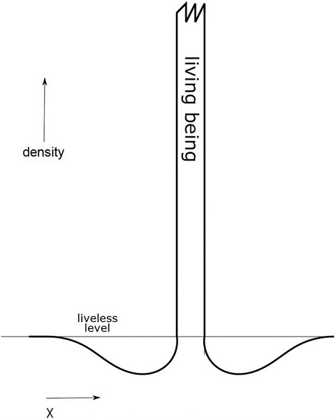 For any given instant of time in the Universe the density distribution associated with a living entity will be very high (even though non-uniformly distributed in the interior of the organized living entity) and very low in its immediate surroundings, asymptotically approaching the value associated with lifelessness towards infinity. The mean value would correspond to the lifeless value; the high value of density in the interior of the organism would compensate for the minimum value in its immediate surroundings through the ejection of entropy.