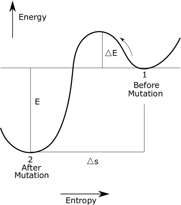 The great stability of many molecules, particularly DNA or any other equivalent code, implies that they are in a state of relative minimum energy. For a mutation to occur and a different state to be reached, a high potential energy barrier, ∆E, must be surmounted, and that barrier must be much higher than the thermal energy, kT (k being Boltzmann’s constant and T the temperature), so the molecule does not easily change its state. This condition, equivalent to a very low temperature, was used by Schrödinger, who considered the gene to be an aperiodic solid, ideally at a temperature of absolute zero. Aside from a leap in entropy, ∆S, the mutation would undergo, independently of ∆E, a change in energy, E, from its initial to its final state, corresponding to a photon emitted in the mutation (see Figure 3).