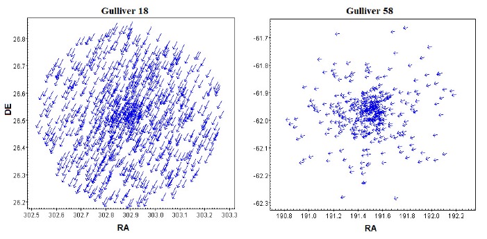 From SIMBAD (http://simbad.cds.unistra.fr/simbad/sim-fbasic), we obtained the cluster centers in equatorial and Galactic coordinates. Gulliver 18 (hereafter G18) is located at (α = 20h 11m 37s, δ = +26° 31’ 55’’, l = 65.526°, b = -3.97045°, J2000) in the Vulpecula constellation, whereas Gulliver 58 (hereafter G58) is located at (α = 12h 46m 4s, δ = -61°57’ 54’’, l = 302.3°, b = 0.9°, J2000) in the Centaurus constellation. Figure 1 shows the negative images of G18 and G58 as taken from ALADIN at DSS-colored optical wavelengths. Cantat-Gaudin et al. (2018) studied the main astrometric parameters of those two clusters, i.e., coordinates, proper motions, parallaxes, and distances as newly discovered clusters in the Milky-Way Galaxy. They used the second data release of the Gaia DR2 database, Gaia Collaboration et al. (2018).