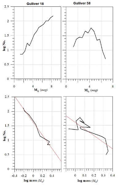where dN is the number of stars in a mass bin dM with a central mass M and x is the MF slope. To convert LF into MF, we used the last version of the theoretical isochrones of Padova’s stellar evolutionary tracks and isochrones. The resulting mass functions of G18 and G58 are shown in the lower panel of Figure 5. The derived values of the MF slope are found to be x = 2.25 and 2.29 (± 0.15) for G18 and G58, respectively, which agree with Salpeter’s mean value.