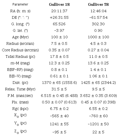 The principal properties of the two open clusters Gulliver 18 and Gulliver 58 were looked into in this paper for the first time using the Gaia EDR3 database. Both clusters are located in the Vulpecula and Centaurus constellations, respectively; they are not sufficiently condensed objects in the sky. The MF slopes of G18 and G58 are found to agree with Salpeter’s (1955) mean value. The two clusters are dynamically relaxed as their estimated relaxation times are much smaller than their ages. Table 1 summarizes the main results of our study.