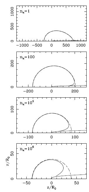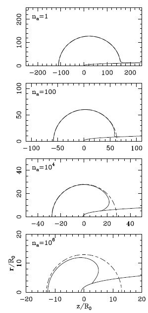 Figures 2-4 show the stellar wind bow shock (equation 1), the ionization front RIF obtained from equation (7), and the ionization front RI obtained from equation (12) of Raga et al, (1997). RI is the ionization front that would be obtained for a star producing a S∗ ionizing photon rate, but with no wind (and therefore no stellar wind bow shock). Interestingly, in all but the va = 20 and 100 km s−1, na = 106cm−3 model, no difference can be seen in the leading hemisphere of the HII region (i.e., for z < 0).