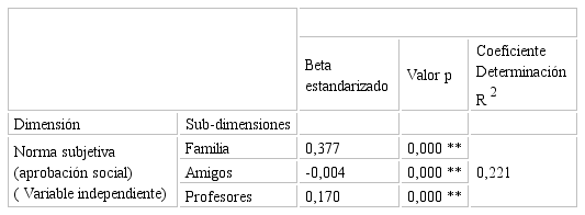 Sin embargo, en la Tabla 6observamos que al eliminar la variable unidimensional ecosistema emprendedor universitario del análisis y trabajar únicamente con las 3 sub-dimensiones de norma subjetiva: familia, amigos y profesores como variables independientes la varianza explicada en intención emprendedora mejora a una capacidad explicativa del 22,1%; mientras que los valores p se presentan en 0,000; 0,000; 0,000 respectivamente en cada una de las 3 variables explicando de forma extremadamente significativa la variable de constructo intención emprendedora. En otras palabras, en ausencia del ecosistema de emprendimiento universitario, la aprobación social de las personas referentes del individuo, familia, amigos y profesores, juegan un rol fundamental en la explicación de su intención emprendedora.