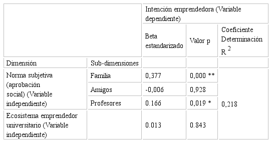 Por otra parte, en la Tabla 5 se desagrega las sub-dimensiones de segundo orden de la norma subjetiva, que con la variable unidimensional ecosistema emprendedor universitario analizan la capacidad explicativa; a través de la técnica de regresión múltiple. Observándose que las sub-dimensiones de norma subjetiva familia y profesores son las que explican de forma significativa la intención emprendedora con un valor p de 0,000 y 0,019 respectivamente. En la que la aprobación de la familia muestra una explicación extremadamente significativa en la intención emprendedora y la aprobación social de profesores explican de forma fuerte la intención emprendedora. Considerando cada una de las 3 sub-dimensiones de norma subjetiva: familia, amigos y profesores; así como, ecosistema emprendedor universitario variable unidimensional como variables independientes que proporcionan una varianza explicada del 21,8% al constructo intención emprendedora.