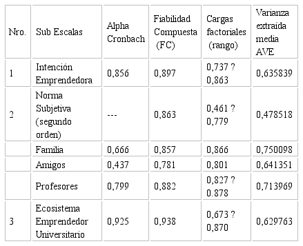 Con respecto a la fiabilidad y validez de las escalas utilizadas para analizar las variables de constructo: intención emprendedora, norma subjetiva y ecosistema emprendedor universitario, en la Tabla 2se presentan los datos provenientes de la información receptada a jóvenes universitarios de la Facultad de Ciencias Económicas y Administrativas de la Universidad de Cuenca que demuestran altos niveles de fiabilidad y validez. La consistencia interna medida a través del Alpha de Cronbach está entre 0.856 a 0.925, la consistencia o fiabilidad compuesta de los constructos está entre 0.863 a 0.938; con respecto a la validez convergente, las cargas factoriales son superiores a 0.461 y las varianzas explicadas están por encima de 0.48, medidas que verifican la fiabilidad y validez de los constructos empleados para el presente trabajo.