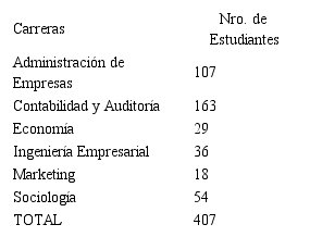La población objeto de estudio la constituyen un total de 407 estudiantes matriculados en los últimos ciclos de las seis carreras de la Facultad de Ciencias Económicas y Administrativas,el número de estudiantes por ciclo que cursan las diferentes carreras, en el periodo de estudio, son ( tabla 1):