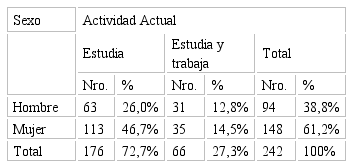 Estadísticos descriptivos.- Se obtuvieron proporciones muestrales en base a las variables sexo y actividad actual con la finalidad de describir la situación de los jóvenes universitarios en estas dos variables.