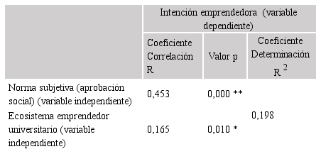 Regresión múltiple.- Se utilizó la variable de constructo intención emprendedora como variable dependiente a explicar en base a las variables independientes de constructo norma subjetiva y ecosistema emprendedor universitario.