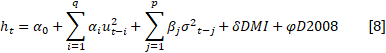 Edwards (2006), se incorpora la variable dummy DMI en la ecuación de la varianza condicional para capturar el efecto que ha tenido el régimen de MI, en el incremento o atenuación de la variabilidad del tipo de cambio. Adicionalmente, se agrega otra variable dummy D2008, que estima el efecto provocado por la crisis de 2008. El impacto de estas variables puede ser evaluado a través del signo de sus coeficientes. Un coeficiente positivo significa que el incremento de la volatilidad del tipo de cambio se encuentra asociado con la adopción del régimen de MI; mientras que, un coeficiente negativo implicaría que la política de MI ayuda a reducir la volatilidad del tipo de cambio (