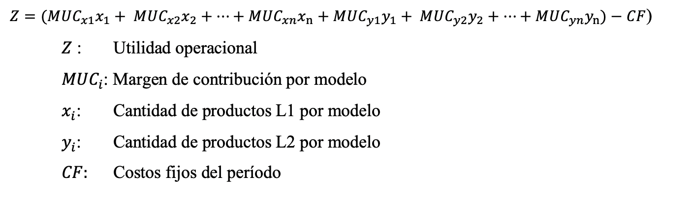 Para la ejecución del modelo, es necesario definir las variables inmersas en la problemática de producción, la función objetivo que relacione dichas variables y sus funciones de restricción, en este caso de forma mensual. La cantidad de cada modelo de L1 y modelos de L2 serán las variables de decisión definidas como L1 (𝑥i) y L2 (𝑦i). La función objetivo del presente estudio, Fórmula 6, es la función de utilidad operacional, la misma que contempla la sumatoria de la contribución marginal por cada modelo menos los costos fijos del período.
