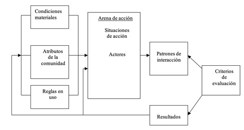 En este apartado se lleva a cabo un análisis institucional sobre el proyecto “El Zapotillo” en su versión de cortina a 105 metros. Para tal efecto se utiliza el marco de análisis y desarrollo institucional de Elinor Ostrom (2007). Los supuestos de esta perspectiva es que existen condiciones materiales, atributos de la comunidad y reglas en uso que influyen en una arena de acción en la cual se presentan circunstancias muy particulares llamadas “situaciones de acción” y unos actores que interactúan en función a unos patrones de interacción que generan resultados sujetos a evaluación. En la Figura 1 se observa el marco de análisis institucional (institutional analysis and development framework, o IAD por sus siglas en inglés) propuesto por la politóloga y premio nobel Elinor Ostrom.