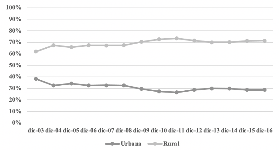 En la Figura 1 se observa la distribución de los hogares beneficiarios del BDH según área geográfica, se puede apreciar que con el paso de los años el BDH se focalizó más hacia los hogares rurales, pues en 2003 el 62% de los hogares beneficiarios se ubicaban en zonas rurales mientras que en 2016 esta cifra fue del 71%. Ahora bien, si se considera la tasa de participación de los hogares beneficiarios en las áreas geográficas, la Figura 2 muestra que en 2003 el 40% de los hogares en zonas rurales eran beneficiarios del programa. Esta cifra aumentó hasta llegar al 65% en 2012, luego de lo cual disminuye hasta el 38% en 2016 debido quizá al déficit fiscal y la caída del precio del petróleo de 2014, que generó una contracción económica en 2015 y 2016. La participación de hogares beneficiarios en zonas urbanas se mantuvo alrededor del 20% entre 2003 y 2013, reduciéndose a 10% en el 2016.