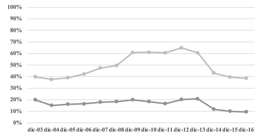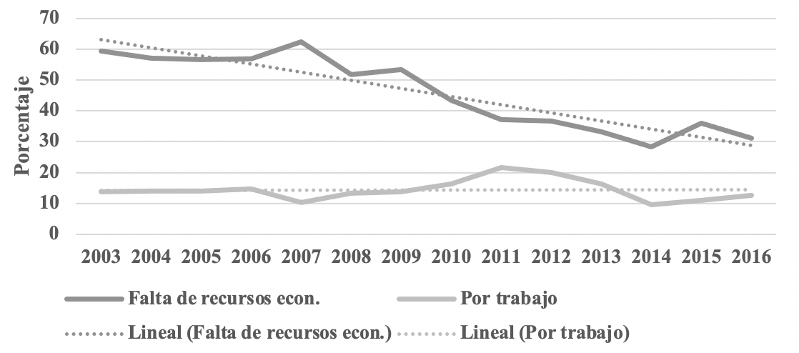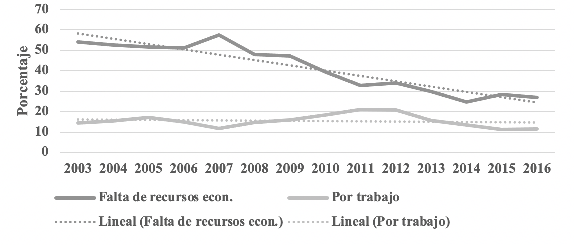 También se evidencia que la falta de recursos económicos como motivo para el ausentismo ha disminuido considerablemente, en 2003 representó el 60% de los hogares mientras que en 2016 fue el 30%. Esta tendencia es igual para hogares beneficiarios y la población total, hecho que pudiera suponer que este efecto no sería atribuible al programa sino a las condiciones económicas generales (Figura 4 y 5).