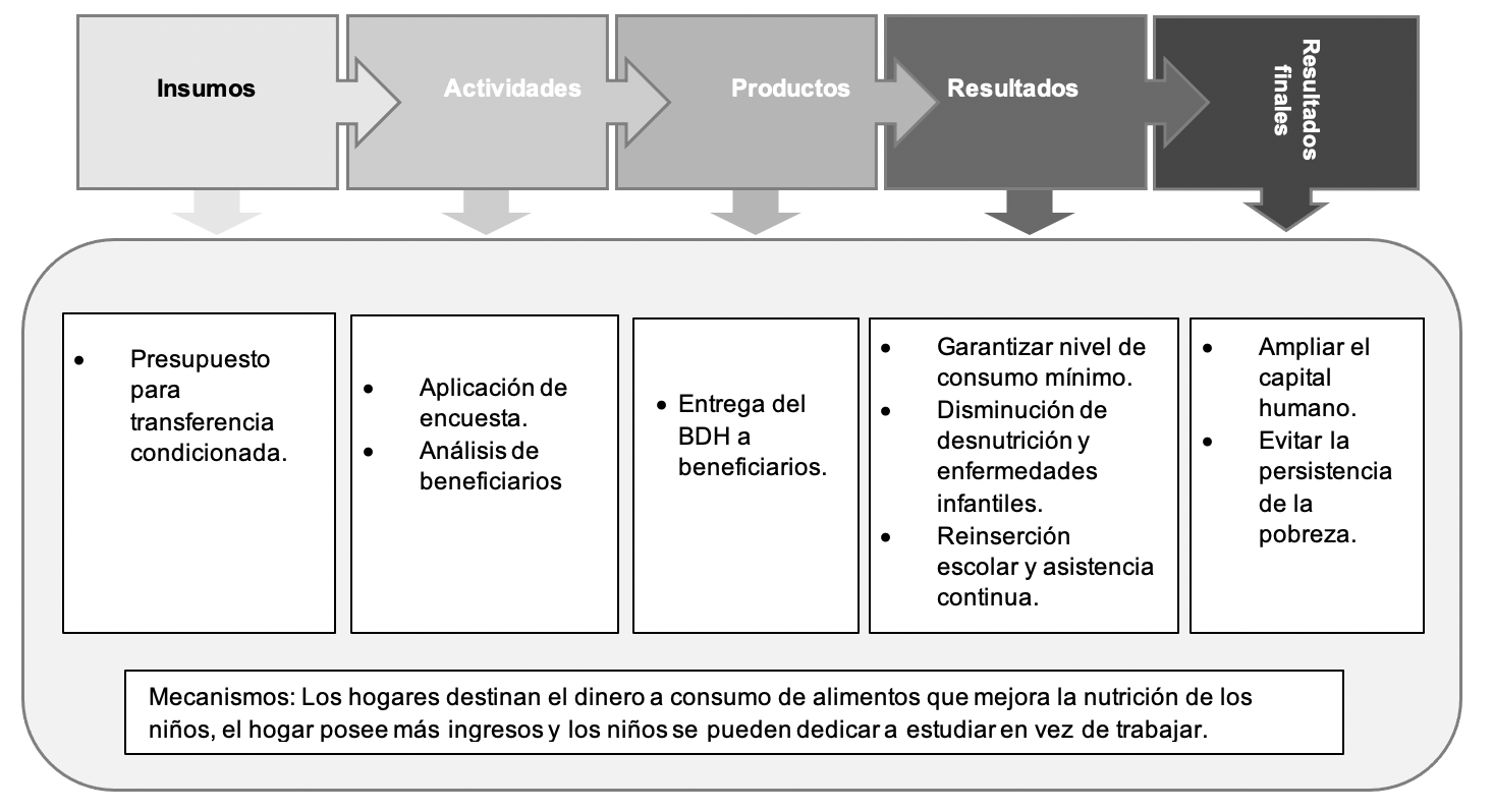 Como se mencionó anteriormente, el objetivo del programa es ampliar el capital humano y evitar la persistencia de la pobreza mediante la entrega de transferencias monetarias condicionadas. Este objetivo que es de largo plazo se ve reforzado por los resultados esperados en el corto plazo: garantizar un nivel de consumo mínimo en el hogar, disminución de los niveles de desnutrición crónica y de enfermedades prevenibles para niños menores de 5 años, promover la reinserción escolar, asegurar la asistencia continua a clases y proteger a los adultos mayores y personas con discapacidad.