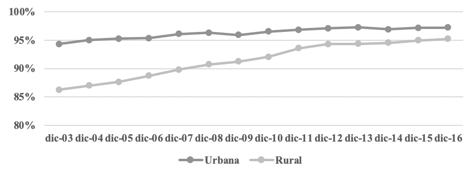 La tasa de asistencia de los niños entre 5 a 18 años en los hogares, se ha visto incrementada considerablemente desde 2003, más aún para aquellos hogares en zonas rurales, con lo cual la brecha entre hogares urbanos y rurales ha disminuido y en 2016 ambas estuvieron alrededor del 96% (Figura 6).