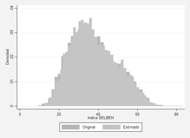 Para estimar el índice SELBEN en la ENEMDU se sigue la metodología propuesta por Amores (2010) quien empleando un análisis de componentes principales calcula los ponderadores óptimos de las 27 variables empleadas en el índice SELBEN utilizando la ECV 1999. Luego, dado que la ENEMDU no posee todas las 27 variables, se estimaron los nuevos ponderadores realizando una regresión lineal del índice SELBEN calculado con la ECV y las 24 variables disponibles en la ENEMDU. En la Figura 7 se puede observar la distribución del índice SELBEN original (ECV) y estimado utilizando las variables de la ENEMDU, en donde no se observan diferencias distribucionales importantes.