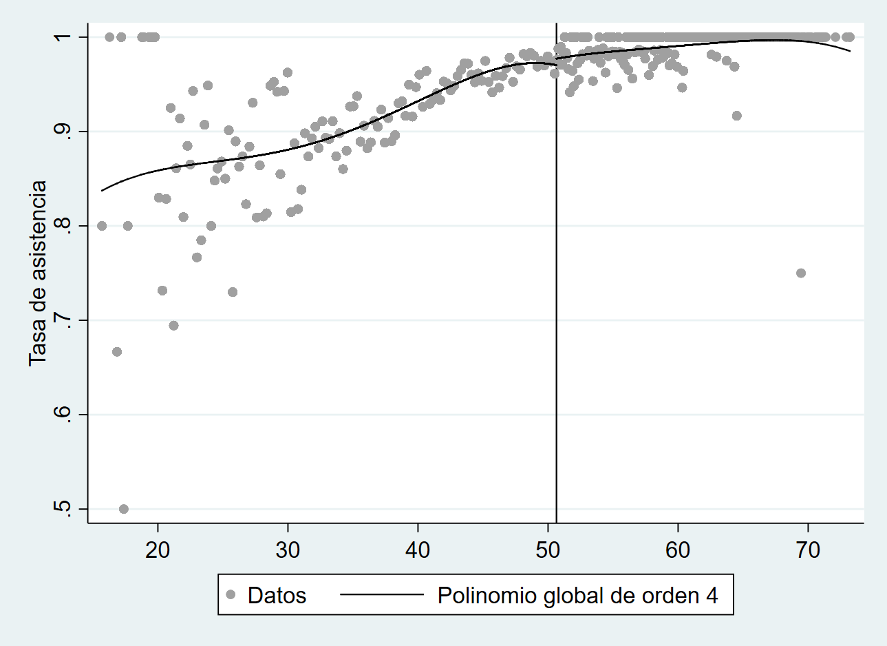Para la estimación de impacto se emplea el paquete desarrollado para Stata por Calonico et al. (2014), en la Figura 8 se muestra el ajuste de regresión para los datos a la izquierda y derecha del umbral del índice SELBEN (50,65). Se puede apreciar una pequeña discontinuidad en dicho umbral, aunque por inspección gráfica parece no ser representativa, lo que se comprobará con la estimación de la Regresión Discontinua. A su vez, este gráfico resulta de aproximar una función de regresión lineal a los datos de la variable de resultado (la tasa de asistencia) dentro del vecindario del punto de corte en la índice SELBEN, evidenciándose que el mejor ajuste por defecto lo proporciona un polinomio de orden cuatro, lo cual se utilizará para la estimación.