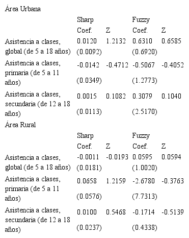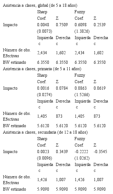 En la Tabla 1 se muestran los coeficientes para la estimación de las distintas tasas de asistencia escolar consideradas, tanto en el diseño Sharp como en el Fuzzy. Los errores estándar se muestran en paréntesis y también el valor Z. En todas las estimaciones no se encontró efecto del BDH sobre la inserción escolar. Además de estas estimaciones se realizaron otras diferenciando entre los hogares en zonas urbanas y rurales (anexo 2); y, otras en donde se incorporó como variable de control la tasa de desempleo provincial. En todas estas estimaciones se llega a los mismos resultados, por lo cual se puede indicar que los resultados son robustos a dichas variantes.